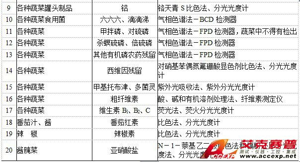 人們廣為食用的蔬菜有20多種、并有相應的脫水、速凍、鹽漬、油漬和罐頭制品、質檢標準中,除與種類有關的各不相同的形態、色澤、質地、成熟度以及其他感官指標之外,還有4大類具有共性的重要理化指標,即營養成份、有害元素、農藥殘留和特殊品種的特定標準,這些都需用分析儀器檢測,可概要歸納如表8所示。