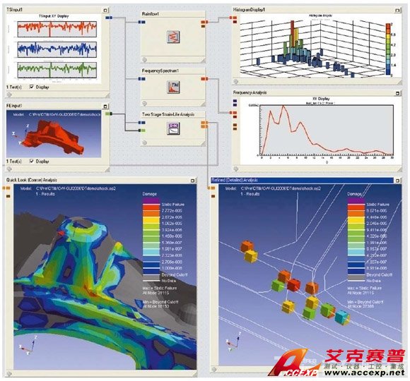 數(shù)據(jù)采集器所記錄的原始數(shù)據(jù)通常需要進(jìn)行分析處理才能變成工程中有用的信息。 原始數(shù)據(jù)的常規(guī)處理通常包括:信號(hào)的顯示、編輯、算術(shù)及三角運(yùn)算;頻譜分析;數(shù)據(jù)格式轉(zhuǎn)換;單位轉(zhuǎn)換、元數(shù)據(jù)處理及報(bào)告等。對(duì)于疲勞耐久性而言,需要鑒別出原始數(shù)據(jù)中所包含的異常信號(hào)并修正這些信號(hào),通過(guò)不同的方法對(duì)數(shù)據(jù)的有效性進(jìn)行檢驗(yàn)。需要將時(shí)域數(shù)據(jù)進(jìn)行付里葉變換,獲得信號(hào)中的頻率內(nèi)容,或者進(jìn)行雨流計(jì)數(shù)得出數(shù)據(jù)中包含的循環(huán)頻次信息。在零部件臺(tái)架試驗(yàn)部門(mén), 需要將采集的數(shù)據(jù)根據(jù)疲勞等效原理轉(zhuǎn)換成一個(gè)加速試驗(yàn)所需的輸入數(shù)據(jù)。而在 CAE 分析部門(mén),則需要從數(shù)據(jù)中提取出有限元分析、多體動(dòng)力學(xué)分析和疲勞壽命分析所需要的時(shí)間域有效載荷譜。另外,從實(shí)測(cè)量中直接預(yù)測(cè)疲勞壽命也是耐久性分析中的一項(xiàng)內(nèi)容。ICE-flow GlyphWorks 就是英國(guó) nCode 公司為了滿足上述工程需要而開(kāi)發(fā)的新一代數(shù)據(jù)處理和疲勞分析工程軟件。