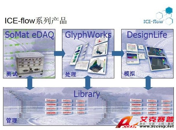 作為著名的疲勞耐久性技術(shù)服務(wù)公司之一的英國(guó)恩科(nCode)國(guó)際有限公司開(kāi)發(fā)了一整套用于汽車(chē)耐久性設(shè)計(jì)、分析、試驗(yàn)及管理的硬件和軟件工具——ICE-flow系列產(chǎn)品。包括:數(shù)據(jù)采集器 Somat eDAQ、數(shù)據(jù)分析處理及實(shí)驗(yàn)疲勞軟件 GlyphWorks、CAE 疲勞分析軟件 DesignLife 和耐久性數(shù)據(jù)管理軟件系統(tǒng) Library。ICE-flow 集工程數(shù)據(jù)采集分析處理、疲勞壽命分析模擬、實(shí)驗(yàn)室臺(tái)架加速和遠(yuǎn)程數(shù)據(jù)傳遞及管理于一身,是進(jìn)行一體化抗疲勞設(shè)計(jì)必備的一個(gè)分析工具, 也是進(jìn)行異地協(xié)同設(shè)計(jì)的有效工具。 ICE-flow系列產(chǎn)品如圖 2所示,以下對(duì)各功能分別進(jìn)行介紹。