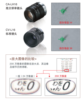 4 不同鏡頭性能造成對比度的差別右圖是使用本公司生產(chǎn)的高分辨率鏡頭 “CA-LH16” 和標(biāo)準(zhǔn)鏡頭 “CV-L16” 拍攝的同一物體的圖像。由于鏡頭的材料及構(gòu)造的不同,造成圖像質(zhì)量也不相同。根據(jù)用途選擇高分辨的鏡頭,可以得到高對比度的圖像。