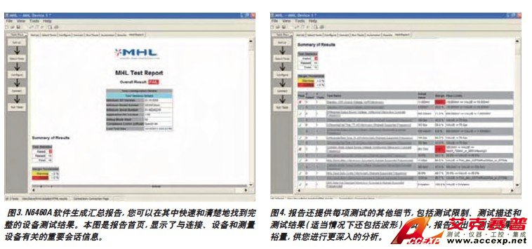 N6460A MHL 源端一致性測試軟件能夠生成全面的報告,其中不僅包括被測設備的性能和狀態,還包括最重要測量的屏幕快照,以便于您進行閱讀和分析。報告的首頁會列出標準規范測試認證程序中要求的設備和配置細節。它還提供帶有超文本鏈接的結果表格,使您可以快速找到感興趣的測量報告部分。圖 4. 報告還提供每項測試的其他細節 , 包括測試限制、測試描述和測試結果 ( 適當情況下還包括波形 )。此外 , 報告給出了測試結果的裕量 , 供您進行更深入的分析。圖 3. N6460A 軟件生成匯總報告 , 您可以在其中快速和清楚地找到完整的設備測試結果。本圖是報告首頁 , 顯示了與連接、設備和測量設備有關的重要會話信息。報告隨后以表格形式列出結果匯總。該表格為用戶提供了大量即時可見的信息。界面左側可以非常明顯地立即顯示設備測試狀態 ( 合格或不合格 )。如果您將運行多項測試,或測試要求有多種分辨率,您將接到警告,要求您留意給定測試的總體狀態,包括測試的嘗試次數以及測試失敗的次數。測試名稱帶有超級鏈接,使您可以直接訪問希望查看的結果 ( 參見下面圖 5 中的眼圖結果 )。該數據還可通過訪問“結果 (Results)”選項卡獲得.