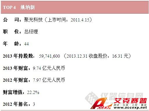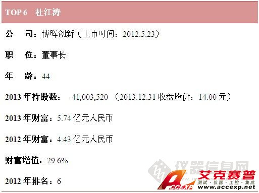 就財富值而言,雪迪龍敖小強憑借100%的增幅穩居財富榜榜首,位居第2位的是聚光科技董事長王健,其2013年財富為18.52億元人民幣,排名第3的是天瑞儀器董事長劉召貴。
