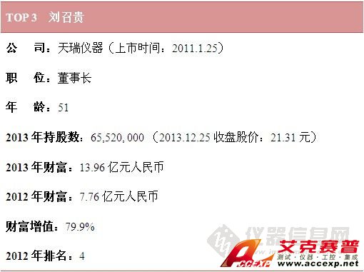 增幅排名第2的是天瑞儀器董事長劉召貴,其財富增長了約80%,2013年個人財富約14億元人民幣。2013年,天瑞儀器收購了環境監測儀器企業宇星科技,之后股價呈現一路漲勢,借此劉召貴的財富實現大幅增長。