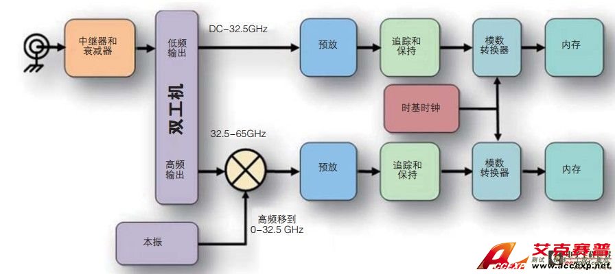 Martin詳細描述了之前的一些技術方案:“為了拓展帶寬,時間隔行掃描是一種常用技術。隨著采樣率的提高,隨機噪聲會均勻分布到新的內奎斯特帶寬上。泰克的競爭對手在高帶寬示波器上采用數字帶寬隔行掃描,對于示波器設計人員來說,其主要優勢是每臺ADC的采樣率只需大于總帶寬。但是這種設計面臨許多挑戰。一旦采集結束,數據放入波形內存,那么必須使用DSP把上方頻段上變頻回到原始頻率范圍。恢復兩個‘一半’頻譜、重建波形非常復雜。由于路徑并不是完全一樣,因此必須在抵消中補償這些差異,抵消則是DSP的一部分。此外,由于兩個‘一半’頻譜中使用急劇的帶通濾波器,因此恢復頻譜的具體中心存在問題。在重復區域可能有平坦度問題,在該點上相位線性度也有問題。噪聲PSD會均勻分布在采樣通道的內奎斯特帶寬上。事實上,使用頻率交織時,噪聲會提高,而且沒有在保持帶寬不變的情況下去降低噪聲的機會。”