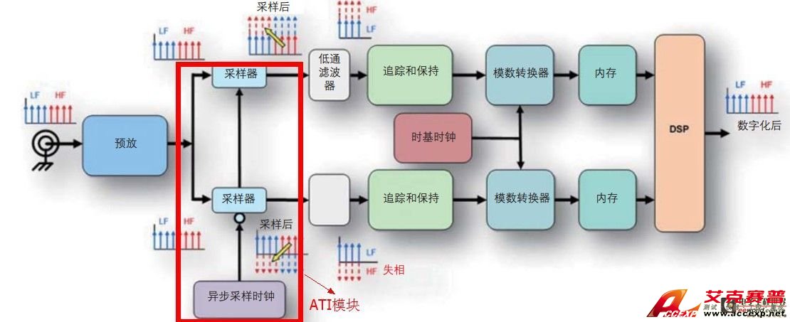ATI中完全對稱的路徑實現理想的性能匹配;每條路徑數字化整個信號,而不只是一半;重建增加了兩份整個信號,可以除以2進行平均,使噪聲下降3dB。Martin對ATI的原理進行了細致的解釋:“在異步時序交織(ATI)技術中,預采樣器作為諧波混頻器。框圖如下圖所示。需要說明的是:路徑是對稱的,ATI中使用兩個ADC采樣整個頻譜,信號的整個帶寬都被應用到兩個ADC,這樣,噪聲的功率譜密度均勻分布到總采樣率中(每個ADC采樣率的2倍),結果,通帶中的整體噪聲要低于類似頻率交織結構中的噪聲。這種設計采用預采樣器,故意對輸入信號進行次采樣,從而產生假信號,或把頻譜成分的上半部分翻回到ADC的內奎斯特帶寬。在最后組合步驟中,本質上是和除以2,這一函數把輸入幅度返回原始值,另外會影響整個采集的噪聲平均,從而進一步降低測量通道的總噪聲。”