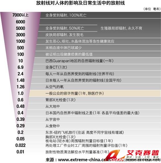 環(huán)境中本身存在的各種放射線輻射對人體是無害的,取決于包括大氣情況和地理位置各種各樣的因素,全世界核發(fā)輻射平均水平在約0.05 μSv/hr - 0.40 μSv/h之間,在中國,這個值是約0.13~ 0.25μSv/h左右。但是, 真正需要關(guān)注的問題不僅包括環(huán)境本底以外的輻射的強度 ,更值得注意的是輻射的累積效用。