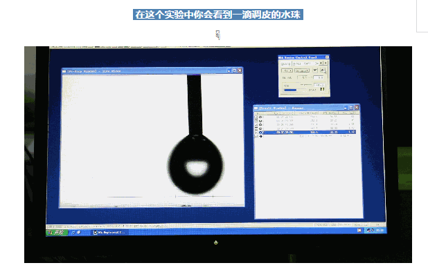 實驗介紹 :實驗者手中拿著的是通過將高分子聚合物和無機化合物相結合制備具有超疏水性的涂層材料,將染色后的水滴滴在材料上,就會出現超疏水效應。