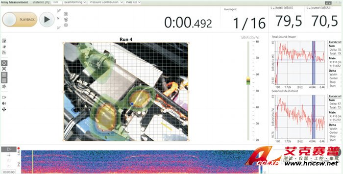 聲學相機的用戶界面所顯示的噪聲云圖、三維頻譜圖、頻譜成分和聲功率