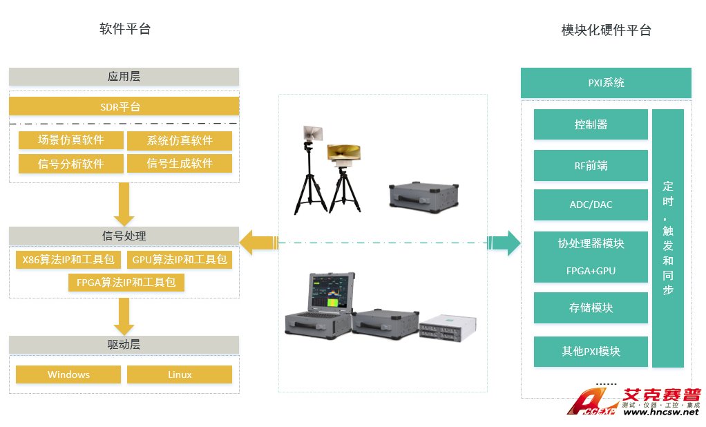 柔性電子對抗測試驗證平臺基于軟件無線電和認知無線電設計理念,采用模塊化硬件,搭載軟件套件,構建一個可重構的、可擴展、可升級的電子對抗綜合測試平臺。同時柔性電子對抗測試驗證平臺也是針對電子對抗應用的高實時性及多功能性要求,全新打造基于CPU+FPGA+GPU異構計算的高性能實時處理平臺,具有強大的通道擴展能力和靈活的功能可重構能力。此外,該平臺也提供MATLAB接口和數據接口,方便用戶進行自定義信號處理,以應對快速更迭的技術需求。