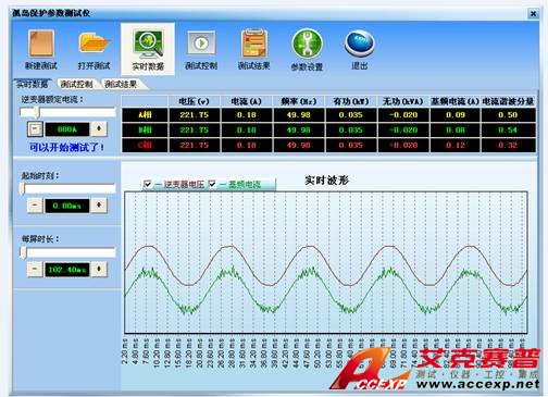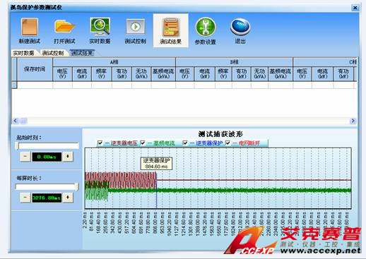 ACT-30H帶有記錄觸發按紐,并帶有輸出接點,可以在斷開電網的同時記錄電網側的電流波形和逆變器側的電壓波形,可以根據波形直接自動算出逆變器的保護時間。