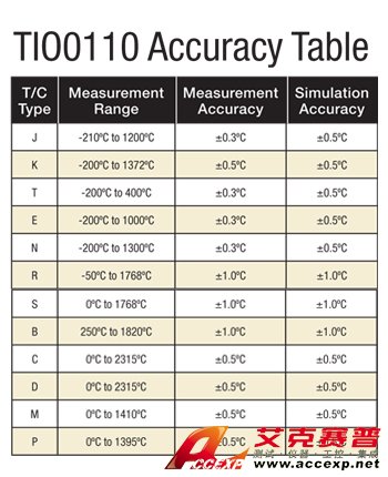 The TIO0110 is a thermocouple (T/C) measurement and simulation module for use with the Meriam MFT 4000 Series Multi-Function Tester. The module will accurately measure or source ±110 milli-Volts (mV) for any of twelve (12) different T/C types according to NIST 175, ITS-90 (default) or ITS-68 standards. In the measure mode, the TIO0110 module converts mV dc to a temperature value in the user-selected temperature unit (°F, °C, °R or °K) and per the selected standard. Milli-volts can also be displayed for direct reading or trouble shooting needs. In the simulate mode, the TIO0110 module simulates an accurate mV signal to a receiving device. Users can enter the precise simulation temperature value, change the value with convenient controls on the MFT, or set-up and select from three Auto-Step or three Auto Ramp test procedures per T/C type. Test points are determined by the user and can be stepped through automatically or manually as desired. See T/C Table 1 below for available T/C types and measurement / simulation accuracy.
