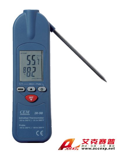簡介:華盛昌CEMIR-98系列袖珍型可折疊多合一測溫儀產(chǎn)品系列 IR-98/99袖珍型可折疊溫度計(jì) 具有非接觸式(紅外)和接觸式(探針)攝溫相結(jié)合的功能,能方便您在不同的場所進(jìn)行測溫。使用紅外非接觸式攝溫功能,只需將儀表瞄準(zhǔn)目標(biāo),然后按壓IRT...