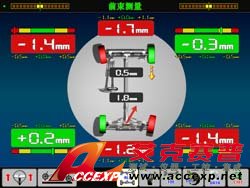 測量系統:外傾角設計了以車輪傾斜和顏色的變化來區分;總前束、獨立前束設計了以車輪的變動和顏色來區分 |