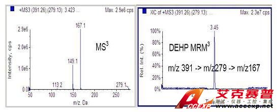 QTRAP復(fù)合型質(zhì)譜儀可以通過(guò)MRM3來(lái)進(jìn)行母離子-子離子-三級(jí)離子三重選擇,消除基質(zhì)干擾,實(shí)現(xiàn)高選擇性定量,選擇性和特異性比普通的MRM更強(qiáng),能夠有效解決假陽(yáng)性問(wèn)題。以DEHP為例,典型圖譜如下圖,大大提高了靈敏度和選擇性。