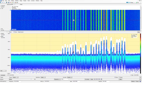 播放記錄的信號可以把觀察等待頻譜違規的時間從幾小時縮短到幾分鐘,您可以在桌面上復核記錄的數據。記錄長度只受存儲介質容量限制,記錄是SignalVu-PC中標配的基本功能。SignalVu-PC應用SV56播放可以全面分析所有SignalVu-PC 測量數據,包括DPX三維頻譜圖。在播放過程中保持最短信號時長指標??梢詧绦蠥M/FM音調解調。提供了可變頻寬、解析帶寬、分析長度和帶寬。可以在記錄的信號上執行頻率模板測試,支持最高40 MHz頻寬,模板違規操作包括蜂鳴、停止操作、保存軌跡、保存圖像、保存數據??梢赃x擇并循環播放的各個部分,重復考察關心的信號。播放可以是無隙的,也可以插入時隙,縮短復核時間。實時速率播放保證了AM/FM解調的保真度,提供了與實際時間1:1播放。記錄的時鐘時間在三維頻譜圖標記中顯示,與真實世界事件相關。在下圖中,正在重播FM頻段,使用一個模板檢測頻譜違規,同時偵聽92.3?MHz中心頻率的FM信號。