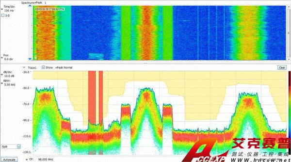 通過無人值守的模板監測功能,可以簡便地查找意想不到的信號。可以在DPX頻譜畫面上創建一個模板,在每次違規時采取相應操作,包括停止采集、保存圖片、保存采集或發送聽得到的告警聲。在下圖中,模板中紅色的地方發生了模板違規,保存了得到的屏幕圖片。模板測試可以用于無人值守監測,在播放記錄的信號時,可以在相同信號上測試不同的違規。