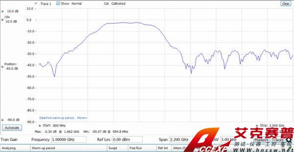 跟蹤發生器 (RSA600上選項 04) 通過 SignalVu-PC 控制。下面顯示了800 MHz ~ 3?GHz的帶通濾波器。選項SV60增加了回路損耗、線損耗和遠程故障。