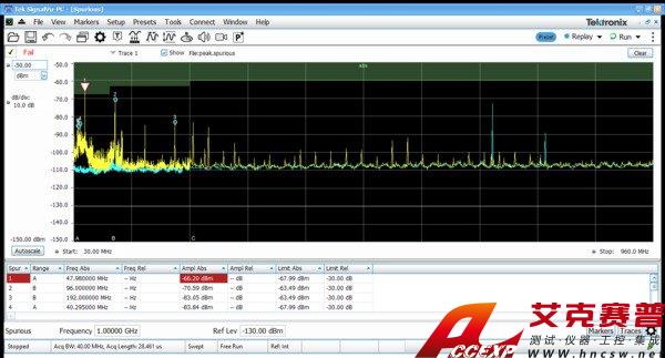 可以使用儀器和 SignalVu-PC,簡便地完成 EMI 預一致性測試和診斷測量。可以在校正文件中輸入和存儲變送器、天線、前置放大器和電纜增益/損耗,可以使用SignalVu-PC的標準雜散測量功能,為測試確定極限行。下圖顯示了 30MHz ~ 960?MHz 測試,其中陰影部分是 FCC Part 15?Class A 極限。藍色譜線是捕獲的環境特點。違規記錄在圖下的結果表中。可以通過選項 SVQP 增加 CISPR 準峰值和平均值檢測器。