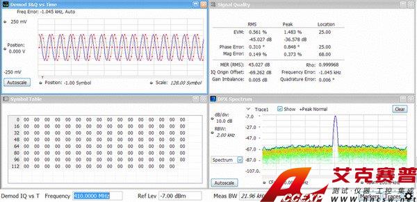 在上圖中,使用 RSA7100A 選件 B800 和 SignalVu-PC 應用許可證 SVMH 分析使用 500?M 符號/秒速度 pi/4-QPSK 調制的 5?GHz 載波。在持續監控 DPX 頻譜圖時還顯示了測量概要、EVM 與時間關系和星座顯示。