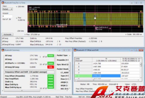 提供了測試通過/失敗結果,支持量身定制的極限。下面的測量顯示了方差相對于時間關系、頻率偏置和漂移、測量摘要及測試通過/失敗結果。