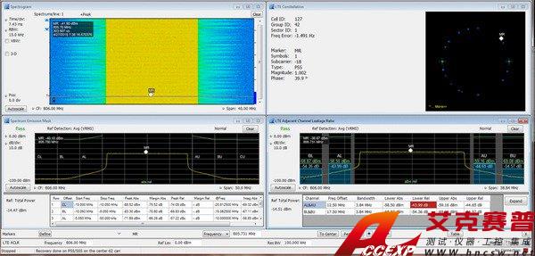 下圖顯示頻譜監測,其中結合使用三維頻譜圖畫面與小區 ID/星座圖、頻譜輻射模板和 ACLR 測量。