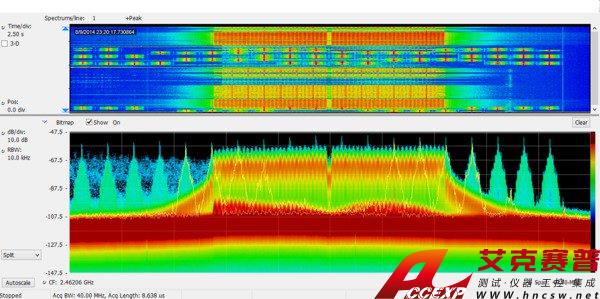 由于 40?MHz 實時帶寬,獨特的 DPX 頻譜/三維頻譜圖顯示干擾信號或未知信號發生的每個時點,支持的最短持續時間可達 27?μs。下圖顯示了WLAN 傳輸( 綠色和橙色),在屏幕中重復出現的窄信號是一只藍牙接入探頭。三維頻譜圖( 屏幕上方部分) 在時間上把這些信號清楚地分開,顯示任何信號碰撞。