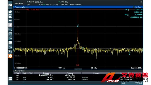 R&S FPL1000 可與高級別分析儀相提并論,它在 10 kHz 偏置(1 GHz 載波)時的相位噪聲典型值為 –108 dBc (1 Hz),三階互調截取點典型值為 +20 dBm,分辨率帶寬為 1 Hz 至 10 MHz,顯示平均噪聲電平典型值為 –163 dBm。因此,它非常適合在實驗室、生產以及維修任務中使用。
