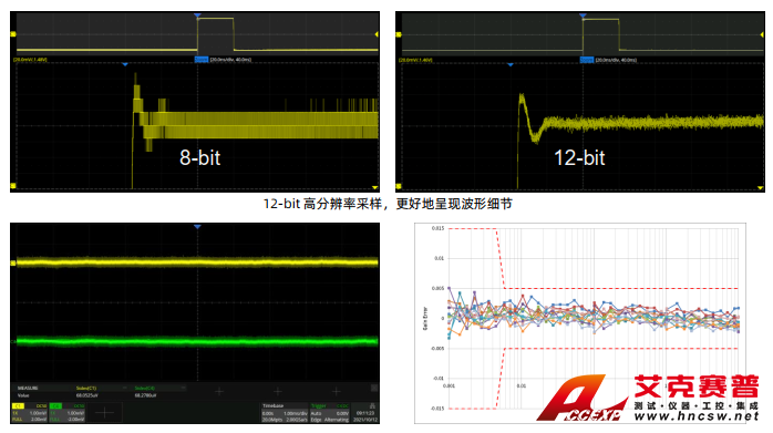 · 12-bit高分辨率ADC采樣,更好地呈現波形細節。相比于普通的8-bit示波器256級量化等級,12-bit示波器可達到4096級,是普通示波器的16倍,具備更小的量化誤差。