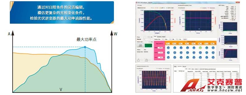 由于太陽能電池利用率不僅與其內(nèi)部特性有關(guān),還受到天氣、季節(jié)、溫度、照度、云遮、下雨和下雪等因素的影響,在不同的時段會具有不同的I-V特性。因此光伏逆變器必須具備應(yīng)對策略,實時調(diào)整太陽能電池的工作點(diǎn),使之始終工作在最大功率點(diǎn)附近,這一過程就稱之為最大功率點(diǎn)跟蹤MPPT。IT6000PV系列標(biāo)配的太陽能電池矩陣仿真軟件可以在實驗室的測試環(huán)境下,去直接模擬各種真實條件下的太陽能電池陣列,從而測試光伏逆變器的靜態(tài) & 動態(tài)最大功率點(diǎn)追蹤效能。