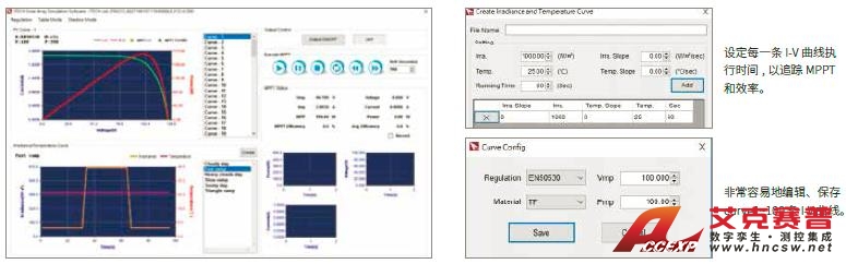 MPPT追蹤效能是光伏逆變器非常重要的規(guī)格,光伏逆變器需要內(nèi)建MPPT機(jī)制,實時地追蹤太陽電池最大輸出功率。因此業(yè)內(nèi)部分組織也定義了一些“標(biāo)準(zhǔn)”的測試形態(tài),以便對不同的逆變器按照相同標(biāo)準(zhǔn)來做比對,對于MPPT效能進(jìn)行測試和提升。IT6000PV標(biāo)配的多通道太陽能電池矩陣仿真軟件內(nèi)置法規(guī)EN50530、SANDIA、NB/T32004、NB/T32004、CGC/GF004的MPPT 測試程序,用戶可以直接選取適宜的法規(guī),設(shè)置對應(yīng)的Vmp、Pmp、材料等參數(shù)、測試運(yùn)行時間以及運(yùn)行最大功率的百分比,屏幕上會顯示I-V 曲線和實時追蹤過程,驗證光伏逆變器的最大功率點(diǎn)追蹤機(jī)制(MPPT)效能,并記錄測試追蹤過程的數(shù)據(jù),生成報表。