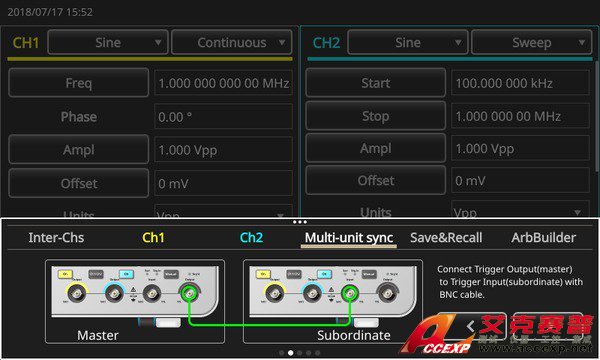 AFG31000 簡化了這個過程,它在屏幕上有一個向導工具,可以引導用戶完成電纜連接和設置配置,實現多臺發生器同步。